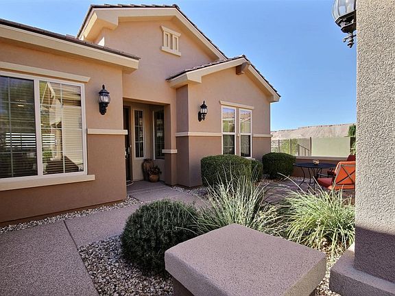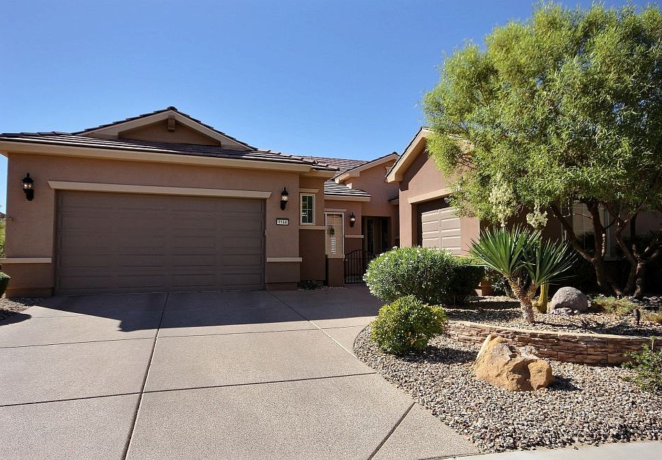 This exceptional Sun City Willow is situated on a quarter acre, premium lot in Split Rail, only a short walk to the phenomenal recreation center and community pools/spa. This exquisite home is tucked away at the far end of a meticulously landscaped and elevated Cul-de-sac. The panoramic view is STUNNING. From this scenic ridge, enjoy a 180 degree view of the southern mountains, colorful mesas, distant Conestoga fairways and desert bluffs. The yard is generously landscaped and the surfaces are a mix of epoxy and pavers. The entry court yard is private and the detached third car garage is ideal for storage and a golf cart. The home is beautifully appointed with wood like and tile floors, attractive cabinetry, granite tops, stainless appliances and custom paint and lighting. The floor plan is open and spacious with 10' ceilings and picture windows at every turn. Other features include a built-in outdoor BBQ, water softener, garage cabinets, fans, laundry cabinets and window treatments.