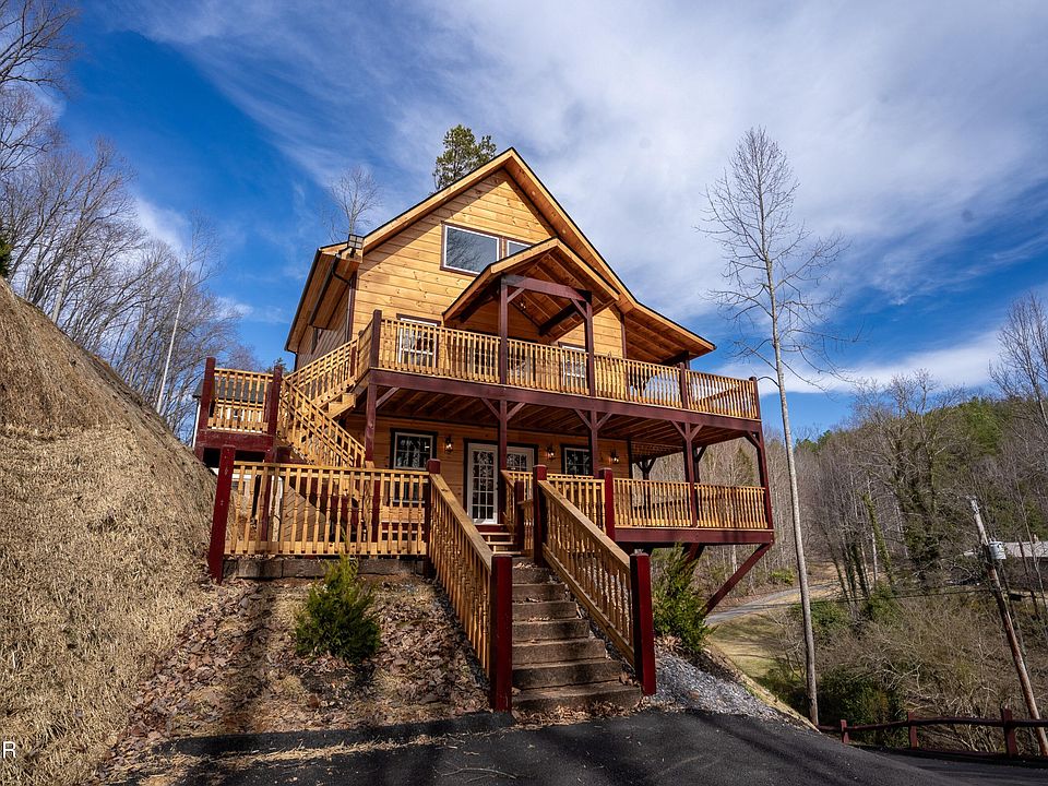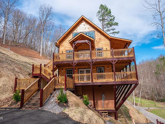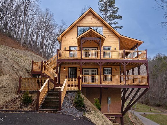 BRAND NEW (2024) FULLY FURNISHED Luxury Cabin style home sitting on a 2/3 of an ACRE LOT in the heart of the Arts and Crafts Community, minutes from downtown Gatlinburg, Dollywood and the Great Smoky Mountains National Park. Projections sourced by the builder's off site management company places this home on track to achieve at least $100,000 in rental income providing for a fantastic investment opportunity at an attractive price point. Featuring 2700 sq ft of sleek - meticulously designed living space, this 4 bedroom 4 bathrooms + GAME ROOM rustic-modern tri-level getaway strikes the perfect balance of luxury, comfort and natural beauty making it the perfect escape for those seeking both adventure and relaxation. Take in the beautiful mountain sunsets gazing at the panoramic views of the beautiful valley on one of the two over-sized wrap-around decks or simply enjoy the crisp Smoky Mountains evenings while soaking in the soon to be installed private HOT TUB. As you step into this exceptional home, the solid pine walls create an inviting warm, cohesive interior that emphasizes the expansive and open concept living area on the lower level complete with game room, mini kitchen with bar area and full size refrigerator, and accompanying theater with pool table for fun family game nights. A bedroom and a private bathroom with a tile surround tub/shower is also on this level as well as the laundry room. As you ascend the stairs onto the main level you'll be wowed to discover a fully stocked chef's kitchen open to the dining-living area and complete with all the amenities you need to whip up delicious meals for yourself or your guests. Dramatic cathedral ceilings and tons of light compliment the open, airy feeling of the space suitable for large family gatherings while the exquisite King ensuite with walk-in closet offers high end finishes like natural slate tile surround in the shower, blown glass sink, and all natural pine clad wall accents. Two French doors on this level allow to swiftly transition onto the oversized deck for gorgeous panoramic views of the countryside. Make your way up onto the lofty upper level to discover the exquisite King ensuite with cathedral ceilings and a stunning tile walk-in shower. An additional Two Twins ensuite bedroom on this level also boasts cathedral ceilings and a private bathroom with a tile surround tub/shower ensuring a luxurious experience and comfort for residents and guests alike. Ample Parking with plenty of space for multiple vehicles ensure convenience for all visitors.