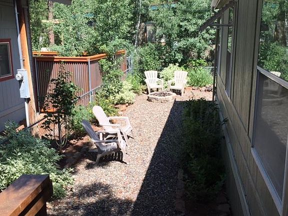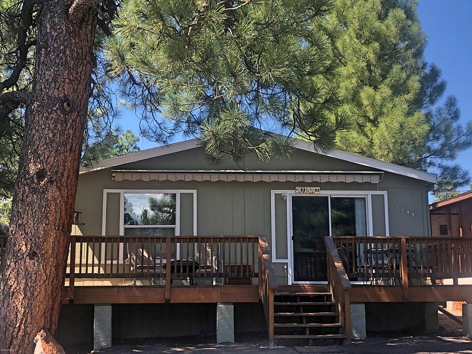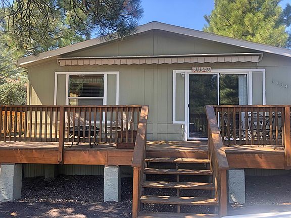 Large doublewide with panoramic views overlooking lovely large ponderosa pines. Three bedroom, two large baths, with basic furnishings to remain. Wraparound deck. Beautiful stripped automatic awning. Fenced yard. Ice cold air conditioning, Smart TV.