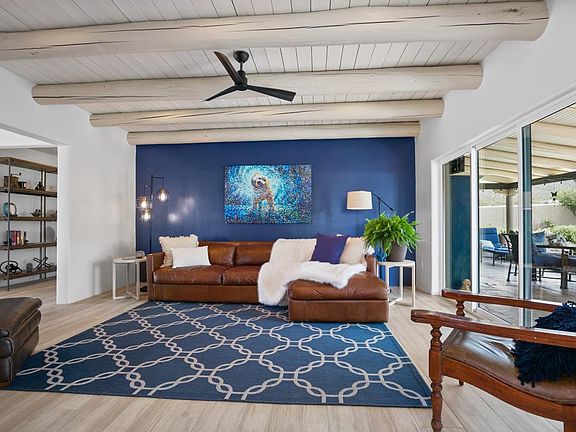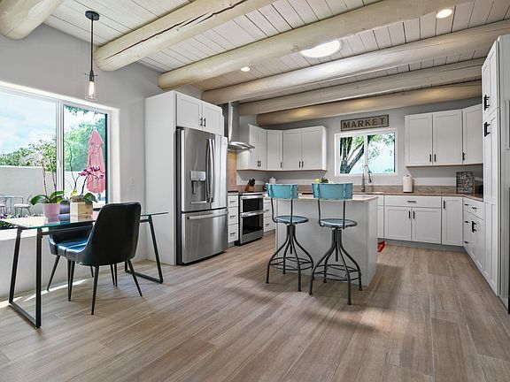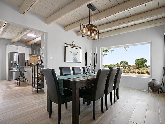 Step into a realm of Southwestern elegance and contemporary charm with this newly remodeled sanctuary in the Weimer Foothills of Taos. Recently featured in Enchanted Homes' Outdoor Edition, this 1.75-acre property offers unparalleled 360-degree views of Taos Mountain, the Sangre de Cristo Mountains foothills, and the iconic Pedernal. Meticulously redesigned in 2022 with no expense spared, this home epitomizes modern Taos style fused with luxurious amenities. As you enter, be greeted by breathtaking vistas from every window, capturing Taos Mountain and the surrounding foothills, sunsets, lights of Taos by night and the magnificent Milky Way. The flexible 2573 sq.ft floor plan has 4 bedrooms and 2 full baths, highlighted by 3 generously sized bedrooms and a versatile fourth bedroom currently utilized as an office space. Embracing southwestern style, this home showcases wide plank wood grain tile flooring that spans across its layout. Enjoy the warmth and charm of three fireplaces, each a centerpiece of comfort and tradition. In addition to comfortable warming there is a newly installed mini-split heat pump cooling system. Recessed lighting with dimmer switches offers ambiance at your fingertips, while wide-louvered shutters enhance both privacy and style. The ceilings are a testament to craftsmanship, boasting a variety of finishes including vigas, coved vigas, and tongue and groove designs that add architectural interest throughout. Solid wood doors and barn doors add a touch of rustic elegance, while built-in shelving provides practical storage solutions.The heart of the home is a chef's delight with a stunning kitchen featuring GE Profile "fingerprint-resistant" stainless-steel appliances, custom cabinets with slide-out drawers, and exquisite Kashmir Cream granite countertops. Natural light floods the interior through new extra-large windows and skylight, enhancing the airy atmosphere. A separate dining area is perfect for hosting intimate gatherings, while a dedicated entertainment den beckons with its cozy Kiva fireplace and many windows. The primary bedroom is a true retreat, complete with diamond-finish plaster walls, a large walk-in closet, and an electric fireplace for cozy evenings. Indulge in the spa-like bathroom, featuring a free-standing soaker tub, custom-tiled shower with bench, dual sinks, and a separate toilet room. Entertain with ease in the expansive family room, where glass sliding doors beckon you to step outside and enjoy the landscaped gardens, multiple patio areas, and a large portal with built-in banco seating, and a relaxing hot tub. A stucco/block privacy wall encloses the lush backyard. Situated on 1.75 acres there is plenty of room to build a casita, studio, workshop or more. The landscaped grounds feature a blend of perennials, lawn with drip irrigation and a variety of trees. Fully fenced sectioned yard is ideal for pets or play areas with a shed providing extra storage space for outdoor essentials. Additional highlights include a generous Laundry Room with built-in sink, ample storage throughout. Plus an attached garage and carport. New septic system. This gem awaits in the coveted Weimer area with convenient access to Town or Taos Ski Valley. Hike or bike out your back door the weimer area offers tremendous access to outdoor recreation including nearby U.S.F.S. trails and public lands. For those seeking a blend of luxury, serenity, and panoramic views in Taos, look no further.