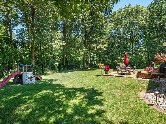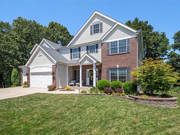 Tucked into the cul de sac on over a half acre in Hearthstone, this stunning home has a back yard paradise with a custom flagstone patio, fenced yard, and wooded back drop. Inside is just as amazing with gleaming hardwood floors, 9' ceilings, formal dining room, large living room with gas fireplace opening to the eat in kitchen with granite counters, center island, stainless appliances, gas stove, walk in pantry, and wine fridge/coffee bar. The den is conveniently located off of the kitchen with built in bookshelves, cabinet and desk to stay. A great cubby area off of the garage and separate laundry with wash tub and half bath on the main floor. Upstairs there is a loft, a bedroom with its own bath, two others with a jack and jill bath, a HUGE master bedroom, large walk in closet with custom shelves, master bath with soaking tub and separate shower and double bowl sinks. AND a finished basement with two living rooms,3/4 bath and tons of storage! Community pool and O'Fallon schools!