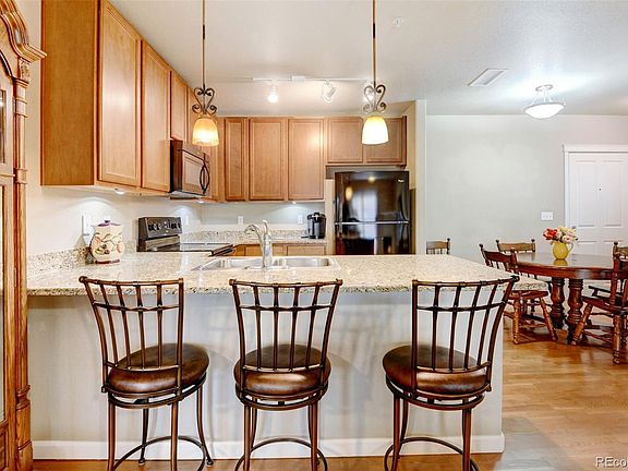 Welcome to Clocktower at Highlands Ranch Town Center and this charming two bedroom, two bath condominium. This unit features an open concept floorplan with hardwood floors throughout the main living areas. A well-planned kitchen with granite countertops and breakfast bar, accented with pendant lighting, flows right into the living room with gas fireplace and sliding glass door access to the private covered balcony. The primary bedroom features an open walk-in closet as well as an ensuite bathroom with walk in shower and additional shelving. The second bedroom sits on the other side of the living room and is adjacent to the full bath. Enjoy the convenience of the in unit full laundry room complete with washer and dryer. The building offers a secure underground garage with elevator access as well as a designated parking spot and storage area. As part of the Highlands Ranch Community Association, homeowners at Clocktower enjoy access to a wealth of community amenities. Members of the HRCA have access to the four state-of-the-art recreation centers, with workout facilities, meeting and event rooms, classroom space, running tracks, basketball, and sports courts, as well as over 25-miles of singletrack trails in the Backcountry Wilderness Area. Living in Town Center and the heart of Highlands ranch you will be in walking distance to an array of shops and bistros as well as Civic Green Park which hosts many plays, festivals, and concerts.