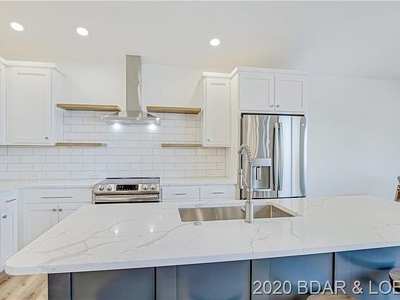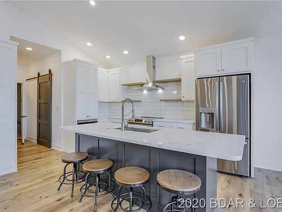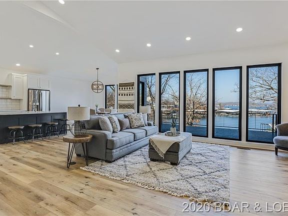 Brand New Modern Luxury on a rare Lot in Lake Ozark!! This beautifully appointed home sits on an incredibly lot!! Almost no steps to the lake, deep water, cove location, and a Big view. This 4 bedroom, 3.5 bath home is professionally designed with beautiful finishes including vaulted ceilings, gorgeous floors, a gourmet kitchen w/ Quartz counter-tops, spacious Master Suite, and 2 living areas. The Master Suite includes tiled walk-in shower and double vanities with granite counters. Downstairs entertaining area includes wet bar with full fridge. Spacious guest suite. Two extra bedrooms off the large downstairs family room. Concrete patio off the lower level and composite deck off the living/kitchen/dining room. Very gentle, sodded back yard with irrigation. Two car attached garage w/ extra parking. Won't last!