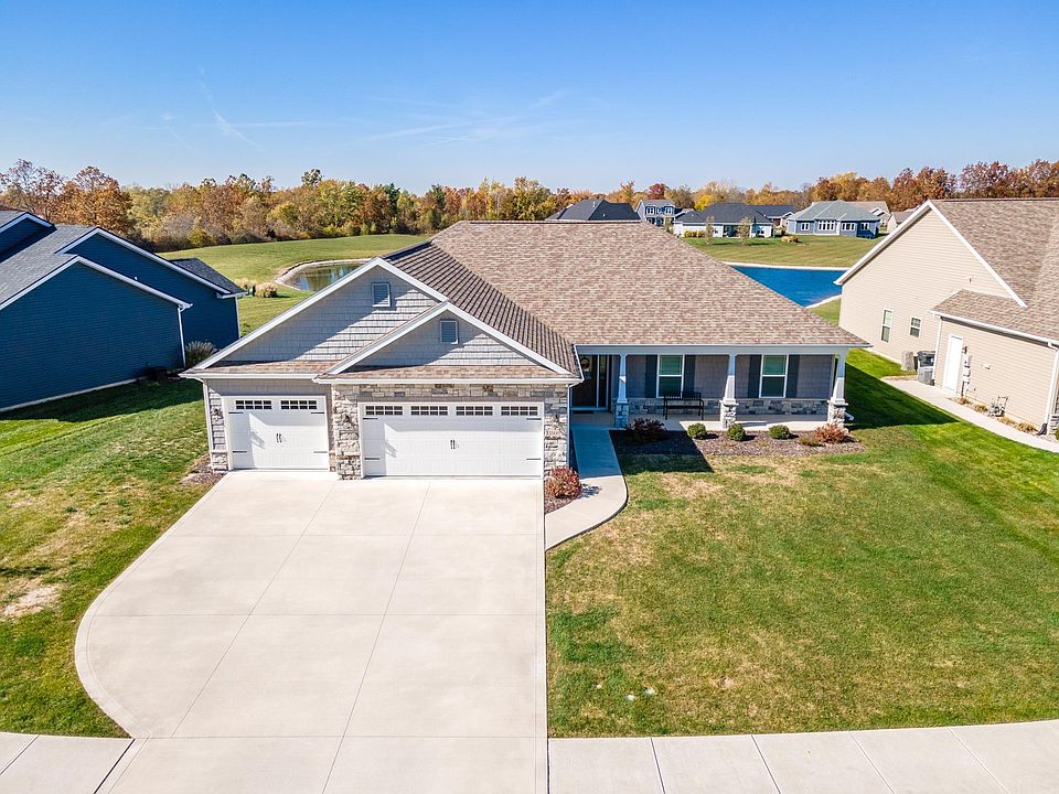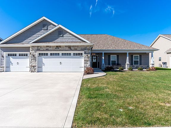 Welcome to Chandon Cove, a beautiful house nestled in the Azbury Park addition. This 3 bed 2 bath ranch features an open concept, split bedroom floor plan with almost 2000 sqft. A vaulted ceiling and dark hardwood flooring greet you when entering into the foyer and continues into the living room with gas log fireplace. The tastefully styled kitchen showcases quartz countertops with stainless steel appliances and flows effortlessly into the dining area. Rest in luxury within the confines of the main bedroom with hardwood floors, tray ceiling, ceiling fan; and the spa-esq ensuite with dual vanity, large walk-in closet, spacious tiled separate shower and garden tub. On the opposite end of the house reside the other two bedrooms, the second full bath, and the den with French doors. Enjoy the views of the backyard and pond from the comfort of the covered porch with ceiling fan. The community pool is a great place to enjoy some fun in the sun without the worry of maintenance. This area is the perfect middle point for enjoying small town comforts with niche shoppes within the charming town of Roanoke or easy commute into Fort Wayne.
