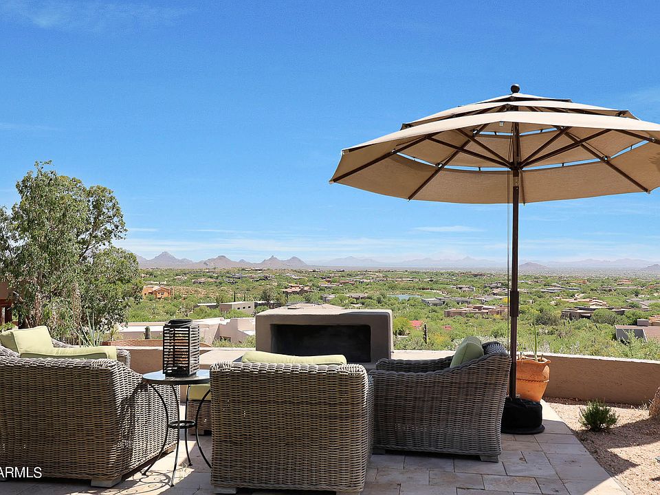 Views, Views, Views, 180 degrees of overlook views off of your private patio. Nestled into the Tonto Foothills with all the peace and tranquility you could want. 3,700 ft. Elevation, 10 degrees cooler temperatures, and often breezy air from this hillside home. Completely Remodeled with Wolf Gas Cooktop, Fisher Paykel Double Drawer Dishwasher, Custom Ash Cabinetry, Kitchen Peninsula and Custom Concrete Countertops. Split Floor Plan Centered around an Expansive Great Room with Vaulted Ceiling and Exposed Beams. Oversized Offset Fireplace brings balance to this Frank Lloyd Wright Inspired Home. Outdoor Amenities include wood fireplace, gas Fire Pit, and a recessed Spa along with all of the views. Garage is detached by a breezeway, Two Car, Extended Length, Expanded Width.