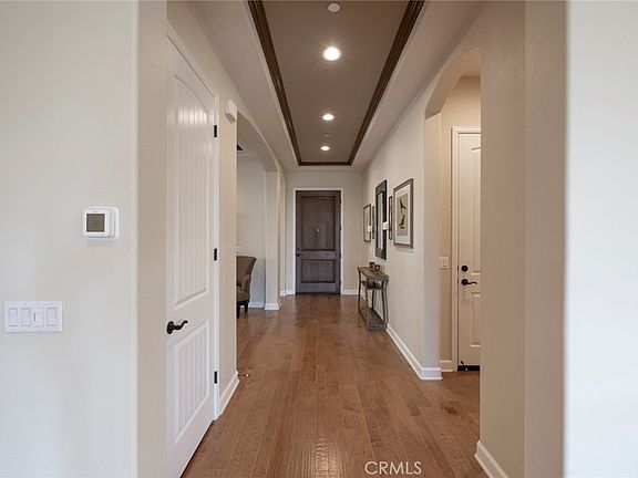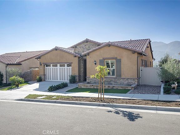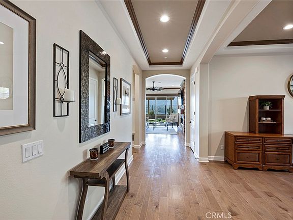 Welcome to the gated community of Terramor, featuring this stunning view home. An award winning 55+ community which has so much to offer. This beautiful 2 bedroom, (plus a flex room) and 2 bath home has a generous amount of upgrades. Starting with beautiful hardwood floors, designer carpet and neutral paint colors, oversized front door, with invisible retractable screen, crown molding, upgraded window casings, remote controlled window coverings, and custom rounded arches throughout. Split sliders off the living room and dining room. Enjoy cooking in this magnificent kitchen with large granite island, upgraded Kitchen Aid stainless steel appliances and built-in refrigerator. Plenty of counter space and walk-in pantry. Oversized master bedroom with master bath with quartz countertops and dual sinks. Walk-in shower, with easy wheelchair access. Huge closet with built-in's. Big laundry room with cabinets and sink, adjacent to the drop zone. Recessed lighting with 10 foot ceilings. Relax in the California room, which has an extended vinyl patio cover. Built-in BBQ and refrigerator. Sit outside by the fire pit and enjoy the mountain view. Pet friendly artificial turf, stamped concrete and beautiful planters for gardening. Two car garage, with epoxy flooring, cabinets, above storage racks, plumbed a water softner and TV connection. Terramor activities include, 2 outdoor swimming pools, one indoor swimming pool, game room, craft room, gym, sauna, barbecue areas, bar, fire pits, garden, dog, parks, tennis and pickle balls courts, bocce ball, sports park, 5 miles of walking trails and monthly events. Situated off the 15 freeway. Close to shopping, restaurants and movie theaters.