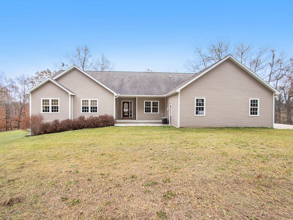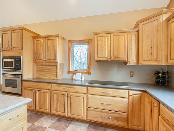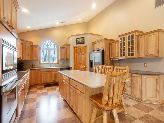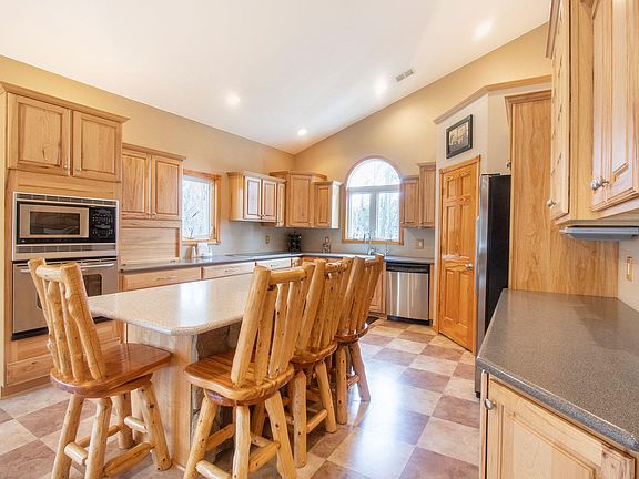 OPEN HOUSE SATURDAY DEC 7TH 12-2 PM! RARE FIND! Custom built ranch style home is nestled on 9 wooded acres. This gorgeous home features 4+ bedrooms, 3.5 bath, main floor laundry, office with french doors, large kitchen with center island and walk in pantry, spacious great room with stone fireplace and cathedral ceilings. Main floor master bedroom and bathroom with access to the deck and hot tub from master bedroom. Radiant heat throughout the home. Heated 2 stall attached garage. Fully finished lower level, great for entertaining. The lower level has a spectacular bar area, full kitchen, bedroom, bathroom, living area, cold storage, and a large activity room with endless possibilities. New boiler installed in 2018. School of choice. Possession 15 days after close.
