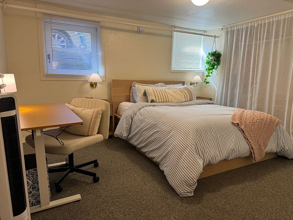Spacious private room in a 2 bedroom basement unit with large windows. House is 8 people but the basement is a shared kitchen and bathroom with just one other person.