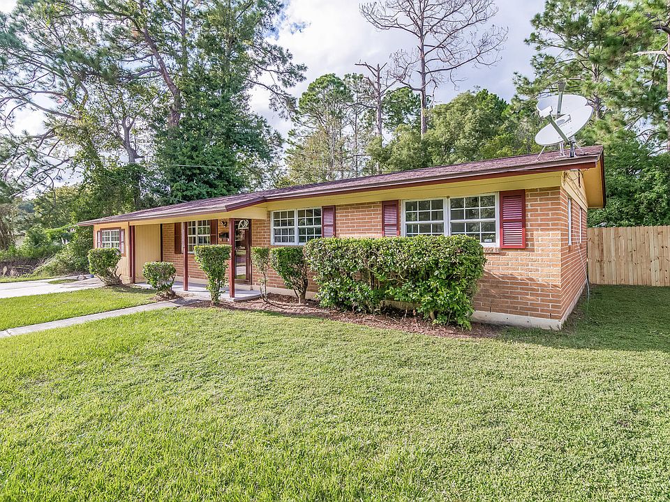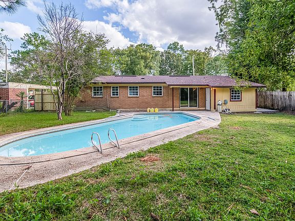 This Jacksonville one-story home offers an in-ground pool, a covered front porch, and a covered back patio.