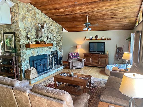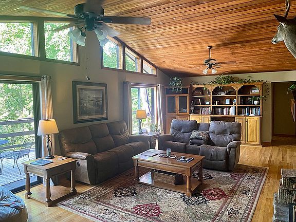 Gorgeous large home with tons of outdoor space for entertaining guests and family. Huge 72x10 open deck and a 18x14 covered porch makes it perfect for all your gatherings! 4 Bedrooms and 3 baths on two levels, complete with second kitchen downstairs. Perfect for visiting friends and family or use as a vacation rental for added income! Tongue and groove ceilings and floor to ceiling rock fireplace with buck stove make for a cozy evening or morning by the fire. Take in the great outdoors with the glass French doors that let in all the natural light. A newer kitchen with island and granite counter tops is perfect for the chef in the family. This home has several built-in units throughout the house including a china cabinet in the dining room for added storage and another set of French doors that lead to the covered porch, perfect for quaint gatherings. All of the bedroom are large enough for king-sized beds. Downstairs is set up for an in-law type suite complete with small kitchen and walk out terrace. There is also a 20x40 detached two-level workshop/garage with 100 amp service.