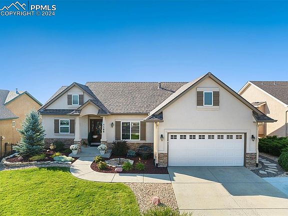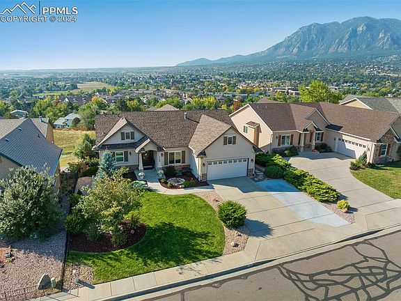 Stunning Rancher with full views of the mountain range and city and a backyard backing up to a meadow. Convenient one-level living. As you walk inside you are greeted with an open concept and tall vaulted ceilings including, 1st floor master with wood floors, balcony, and adjoining 5-piece bath with spa shower, double vanity, walk-in closet. Entertaining possibilities abound with a vaulted ceiling open plan, incorporating the living room with wood floors, an inviting gas fireplace, large dining area, gourmet kitchen and lovely den/breakfast nook. There are 2 sets of sliding glass doors to a large maintenance-free deck, where you can enjoy the Colorado weather, and mountain views. Main level laundry room has a wash sink adjoining a fully-insulated painted 2-car oversized garage with heat, cabinets and shelves and an expanded driveway. The basement is fully finished with a large family/rec room with a cozy gas fireplace and walkout to the backyard. 2 of the basement bedrooms share a Jack and Jill bath with a free standing shower and double vanity. The 3rd bedroom makes use of another 3/4 bath in the hallway. A large storage or play room offers additional useful shelves and storage space. Exterior has easy maintenance stucco and stone siding. Water heater in 2023, upgraded electrical panel in 2021, impact-resistant roof in 2020, fresh interior paint in 2021. Humidifier, blinds, security cameras, radon system and much more. Fenced level lot with auto sprinklers and mature plantings. The lower level extended patio is great for lounging in the sunny Colorado days (patio is hot-tub-ready with electric hook up). Convenient location near the historic Broadmoor Hotel, Fort Carson, Quail Lake Park, Downtown Colorado Springs, United States Olympic & Paralympic Museum, Shopping, Entertainment, and Cheyenne Mountain State Park.