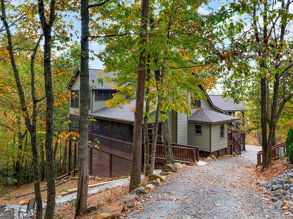 Welcome Home to this beautiful mountain home in Big Creek Mountain! This well-maintained home has so many features to enjoy! Plenty of outdoor spaces, including screened porches all around to enjoy nature and the lovely, long range mountain views! The home features a large, open great room, dining and kitchen with beautiful wood, vaulted ceilings. Gorgeous stone fireplace to warm you up on the chilly winter evenings! Bright and beautiful kitchen with solid surface counters, stainless appliances, and lots of cabinet space. Main level also features primary bath with private bath and walkout to the large screened porch, laundry room, 1/2 bath for guests and walkout to TWO large, screened porches and grilling deck . Upper level features two guest bedrooms (one with lovely enclosed sunporch), full bath and large loft overlooking the great room. Lower level features a lovely area for guests or teens, including a bedroom, full bath, and kitchen (separate outside entrance and well as access from indoors). Lower level also includes a large garage and workshop area. A large carport area below the upper level deck for all the extra toys! Lovely, natural, easy maintenance landscaping. Enjoy an evening fire in front the cozy firepit! Home is located in a small, private, and quiet community with mountain views, paved roads, gated entrance and close to quaint Ellijay. Some furnishings included. New Roof!!