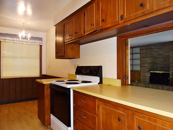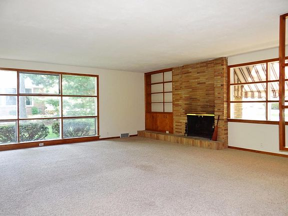 Hans Geyer Contemporary with a wonderful open concept living dining room featuring wood burning brick fireplace wall and access to side patio just perfect for entertaining. Plaster walls plus hardwood floors in the two spacious bedrooms and hall. Lots of closet storage throughout. Convenient kitchen has wood cabinets, range and refrigerator. Full basement with potential, newer furnace and one month old water heater. Private yard, shed and one and a half car attached garage.