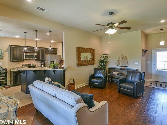 Exceptional home just minutes from the Gulf Of Mexico. This home features handscraped hardwood flooring, tile and carpet in bedrooms. Beautiful 5 cm granite counters are in kitchen and baths. Tile back splash accents the kitchen that has stainless steel appliances including fridge. Don't miss the double-door large pantry in the laundry area off kitchen. The master bath has a garden tub and separate shower. Outdoor features include a landscaped lawn with mature plantings and a fenced back yard. The extra large patio area is great for cookouts or just relaxing. Gutters are in the front and rear. Upgraded features throughout home, including dimmers on lighting, exterior dusk to dawn lighting with sensors front and rear, security system. Painted drive, walkway and garage floor. All blinds remain. Gold Fortified Construction by DSLD Homes with hurricane panels.