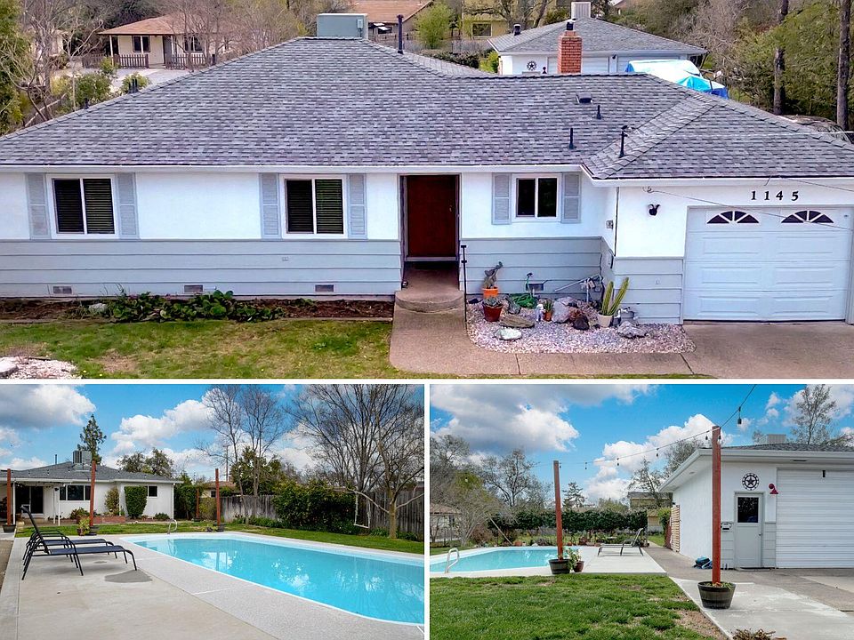 CENTRALLY LOCATED 3 bedroom 2 bathroom home w/ a SHOP & a POOL just minutes from all amenities, shopping, schools, & freeway access! WELCOMING bright & open living space w/ attractive wood-burning fireplace w/ brick hearth, beautiful hardwood flooring, tray ceilings, updated bathrooms, NEWER ROOF, & attached finished single car garage. Sliding door from the dining area leads to the ENTERTAINER'S DREAM back yard complete w/ a covered back patio w/ a fan, inground POOL, fire pit, water feature, chicken coupe, raised garden beds w/ irrigation, fruit trees (apricot, cherry, apple, peaches, blackberry/raspberry), & a large gate at the side for access to the huge detached 2 car garage/shop & RV/Boat parking. All on half an acre of land! MUST SEE!