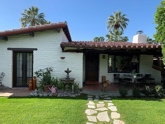 This property is a private, full-time residence and may have been the former home of Betty Grable and Harry James -- Old Palm Springs Movie Colony East at its best. This charming 1934 real adobe Spanish compound has been restored and well maintained. Upgrades include 52 solar panels, newer water, electric, and gas lines. There are two casitas and the main house with a total of 4 bedrooms each with ensuite bathrooms. There are two full kitchens and four fireplaces. The main house has two master suites and fireplace in Living Room. Formal dining room with open beam ceilings. The courtyard, paved with heat resistant tiles, has an outdoor fireplace and surrounds a kidney-shaped "spool" with mountain views. The grounds are a tropical paradise offering complete privacy.