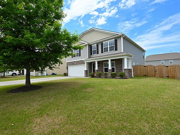 This beautifully updated 4-bedroom home showcases a high-end, designer look with the cozy feel of Pottery Barn or Restoration Hardware. Freshly and professionally painted, it features luxurious quartz countertops, stylish new hardware, and brand new carpet and luxury vinyl plank (LVP) flooring throughout the home. Carefully selected designer lighting adds the perfect finishing touch to the clean, elevated design. Inside, you'll find spacious living areas, a bonus room, and a flexible additional space that could easily be enclosed to create a private office, playroom, or fifth bedroom. The outdoor spaces are just as thoughtfully done, with a huge fenced backyard, a custom swing pergola, a cozy firepit area, a storage shed, and a spacious 2-car garage. Solar panels dramatically reduce utility bills, offering energy efficiency and long-term savings. The community also offers wonderful amenities including a walking path, fishing pond, community pool, and playground. Conveniently located near Raleigh and surrounding areas, this home perfectly blends designer upgrades with everyday comfort. Fresh, welcoming, and move-in ready — this is the beautifully finished home you've been waiting for!