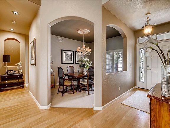 Beautiful BristleCone Patio home located on a quiet cul-de-sac just off the Ridge at Castle Pines North Golf Course with views! The open concept floor plan boasts soaring ceilings, hardwoods, plantation shutters, built-ins and more! Upon entry, formal dining features curved archways and overlooks the front porch. Just beyond, the gourmet kitchen offers ample cabinetry, granite counters, built-in oven and microwave, Jenn-Air gas cooktop, and breakfast bar for informal dining. The adjoining breakfast nook opens to the private 27' x 11' deck with amazing views, perfect for entertaining. The adjacent great room features vaulted ceilings and a cozy gas fireplace flanked by built-ins. Complete with a walk-in closet and 5-piece ensuite with heated floors and soaking tub, the sun-drenched master suite beckons relaxation. A perfectly sized 2nd bedroom is served by a full hallway bath.