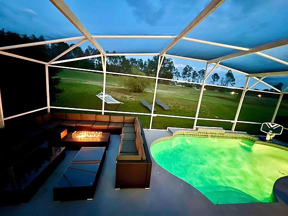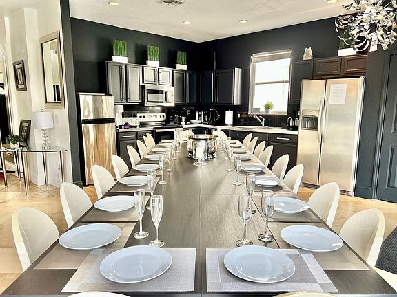 Welcome to this stunning DisneyEstate Golf, Tennis, and SPA Resort Home, a luxurious 14-room property with a spacious 5,000 square feet, including a 3,500 square feet interior and a sprawling 1,500 square feet pool patio. This home is perfect for family reunions, celebrations, retreats, and golf trips, featuring 11 bedrooms with an optional 12th bedroom in the movie room and 6 bathrooms. The villa can accommodate up to 20 adults plus children, offering a fully equipped kitchen with top-of-the-line stainless steel appliances, including a Nespresso cappuccino and latte maker, and a soda stream. The kitchen's large table can seat up to 20 people, making it ideal for family dinners or group gatherings. The living room is furnished with an oversized sofa group, coffee table, and a 75-inch Smart TV, providing the perfect space for relaxation and entertainment. Designed with entertainment in mind, this villa boasts a total of 14 TVs throughout the home, ensuring no shortage of entertainment options. The in-house Movie-Game and Golf Studio is perfect for movie lovers, gamers, and golf enthusiasts, featuring a state-of-the-art short-through ceiling-mounted projector for a real in-home movie theater experience. The outdoor patio offers seating for up to 24 people and a BBQ grill, perfect for cookouts. The villa's bedrooms are fully customizable to suit your needs, with options for king-sized beds or twin beds, ensuring a restful night's sleep. The bathrooms come complete with high thread count bath linen, providing a pampered and indulgent experience. The villa offers a complimentary BBQ grill for outdoor cooking and free car parking for up to three vans per home, with additional guest parking on the road. For sports enthusiasts, there is free tennis on one tennis court and a Golf Simulator and Launch Monitor used by PGA pros available upon request. An optional Golf Membership is also available, so inquire for more information. Located in the BEST LOCATION inside Highlands Reserve Resort, this property offers breathtaking views overlooking the Golf Course, just 200 yards from the Club House. The villa is conveniently located within walking distance to the Tennis Court, Community Olympic Size Swimming Pool, Playground, and Pro Shop. Dining and shopping options abound, with hundreds of restaurants, bars, and outlet stores nearby. The Publix grocery store is less than a mile away, and the property is just a 9-mile drive from Disney World, allowing you to enjoy the magic and excitement of the parks while having a peaceful retreat to return to. Nearby attractions also include a water park H2O about 7.5 miles away and an Epperson Crystal Lagoon about 50 miles away, perfect for day excursions. The villa is designed to cater to smaller groups, with rates varying based on the number of adults and children, season, holidays, particular events, and length of stay. No third-party reservations, non-registered guests, or local visitors are allowed without prior approval. Music outside is restricted to mobile phones or headsets and must be completely hushed after 10 p.m. on weekdays and 11 p.m. on weekends. Parking is limited to three vans per home, with no parking on the grass. A visitor's agreement must be signed after the reservation, acknowledging the house rules and community home bylaws. For those needing to work during their stay, the villa provides a quiet place with a laptop, computer, and desk to catch up on work. The property is remote work-friendly, ensuring you can stay connected and productive while enjoying your vacation.