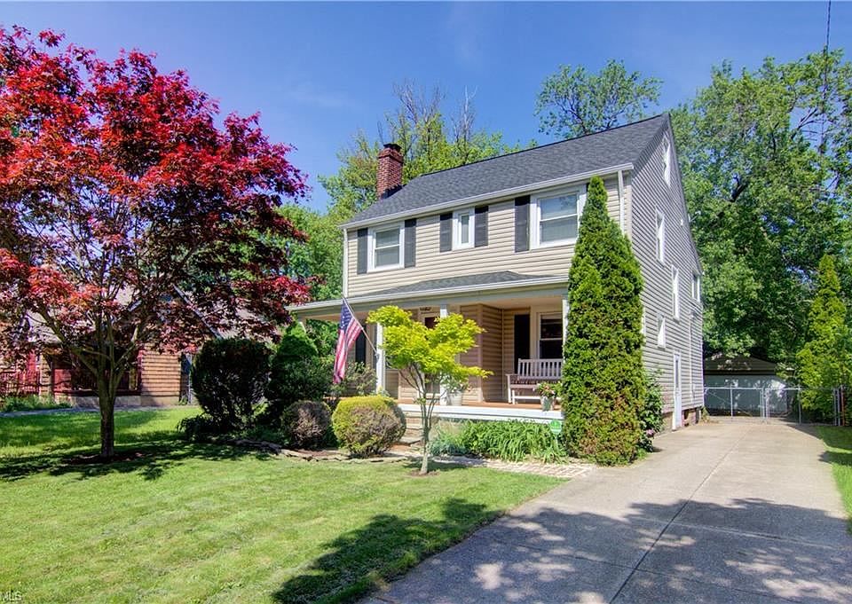 Spectacular, updated move-in ready home on a lovely tree lined street. This charming front porch colonial offers everything you want and need. Spacious living room with fireplace, formal dining room w/hardwood floors, built in cabinets, and slider to backyard patio. Roomy eat-in kitchen has wood cabinets, stainless steel appliances, and excellent layout for cooking and entertaining. Convenient half bath on 1st floor is a nice size. 3 spacious bedrooms upstairs plus extra sunroom/office and updated main bath. Walk up unfinished attic has tons of storage space. The basement offers a fantastic rec room plus laundry and additional storage. Concrete patio overlooks the fenced in backyard. 2 car detached garage, relaxing front porch, and stunning landscaping. New roof in 2017. Vinyl windows, CENTRAL AIR, and more! Great location is a short drive to University Circle, the cultural hub of Cleveland, CWRU, hospitals, museums, and an easy commute anywhere on I-271 or I-90. Eligible for Howard Hanna's money back guarantee. Home warranty included for peace of mind.
