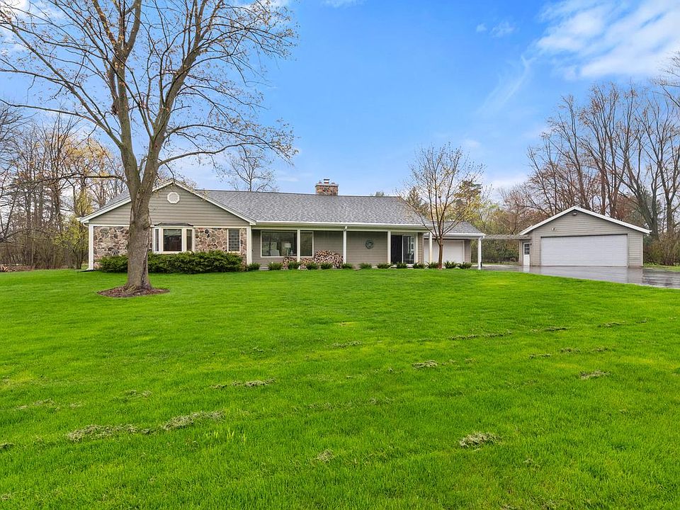 This spacious, stairless ranch situated on 1.5 acres provides rural tranquility while being just minutes away from the city. Great open concept floor plan makes this home feel airy and bright with ample natural light. The generous living room features a natural fireplace and exposed beams. The kitchen is full of rustic charm with a dining peninsula overlooking the living room and tons of storage. Enjoy your meals in the formal dining room or in the tranquil sunroom overlooking your beautiful backyard. The foyer provides a great space for a home office or potential third bedroom. The converted attached garage provides a great basement rec room alternative. The detached 3.5 plus car garage is heated and ideal for hobbyists and collectors looking for workspace or storage for their toys.