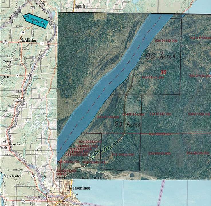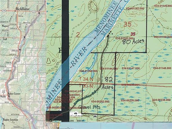 Executive retreat on 80 wooded acres at the end of a dead end road with over 3,000 ft. of sandy frontage on the Menominee River at only $2,800/Acre. This property has complete privacy with easy access, only 3.5 miles north of HWY 180. Endless opportunities right out your front door including boating, fishing, swimming, kayaking, hunting, walking trails, and the list goes on. This land also makes a great investment with harvestable timber, public road access, electricity, and waterfront.Includes a fixer upper cabin with many outbuildings. Better call today before it is gone!
