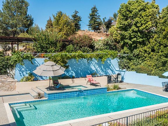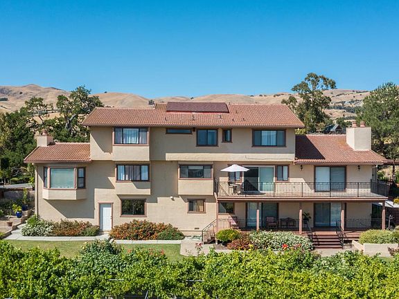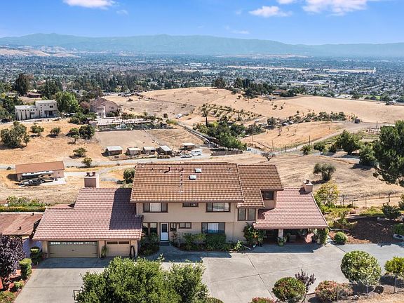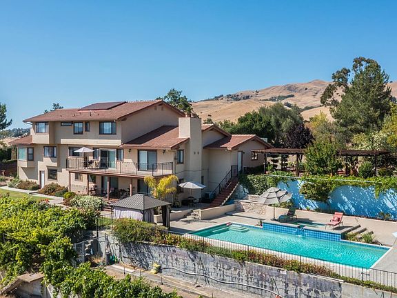 Huge price reduction. Beautiful custom 3 story Contemporary Ranch Home. 5 bed and 5.5 bath, 4,633 sq ft on over 4 acres with gorgeous mountains and city light views. Property boast a 3 car attached garage with gorgeous outdoor entertaining with sparkling swimming pool. Private Gated Entrance large driveway and extra parking. Large upgraded Kitchen, with custom cabinetry, granite countertops, newer appliances, separate living and family rooms w/high ceilings. Bedroom on main floor with full bathroom. Upper floor has 4 Beds, 3 baths included Master Suite with high ceiling, walk-in closet en- suite bath w/sauna. Lower level has wine cellar, large game room w/bar, full bath, opens out to back yard with built-in barbecue, grape vines and fruit trees. Large separate 1,500 sf. shop/ garage on the lower area of the 4 acre lot. This property is ideal and large enough to a have vineyard plantation, have animals such as horses or run a business with the extra space to park trucks and equipment.