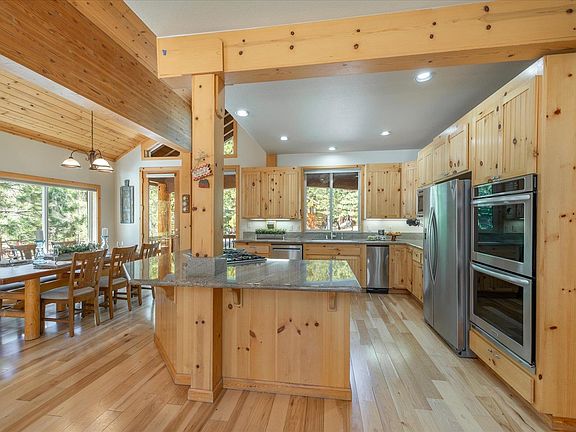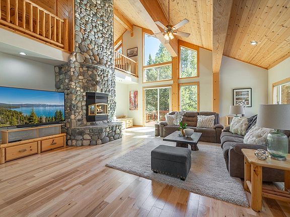 Nestled on a spacious and RARE Tahoe Donner Golf Course home site and adjacent to the 3rd fairway, this large-scale chalet brings warm ambiance and a welcoming vibe to your mountain lifestyle! Designed for comfort, the spectacular light filled great room brings easy access to the upper and lower decks – and BIG spa! Highlights include soaring ceilings, a gorgeous wood burning fireplace surrounded by river rock, extensive view windows, spacious dining area and a well-designed kitchen with front deck access. For professionals working remotely, the loft/alcove above the great room provides a convenient and private area to conduct business. Adjacent to the great room and in its own wing, the sunny primary suite brings private rear deck access, a large walk-in closet and thoughtfully update en-suite bathroom. A second bedroom, shared bathroom, extensive storage and access to the upper game room/loft brings living convenience. The property’s lower living level offers a family/game room with a gas stove and wet bar perfect for year ‘round family fun. A second en-suite bedroom plus two guest bedrooms, shared bath and laundry facility completes this spacious retreat. Perfect for year ‘round or vacation living, you'll have plenty of room for guests and fun! Offering a gorgeous setting in one of Tahoe Donner’s most coveted areas, this beautiful chalet has been meticulously prepared for market with the utmost level of care and attention. Sure to please on so many levels, here is the mountain property your family has been awaiting!