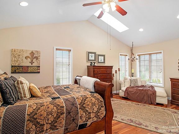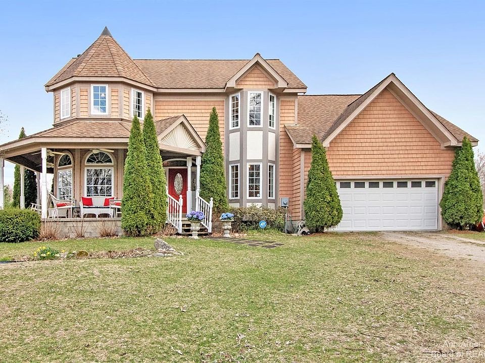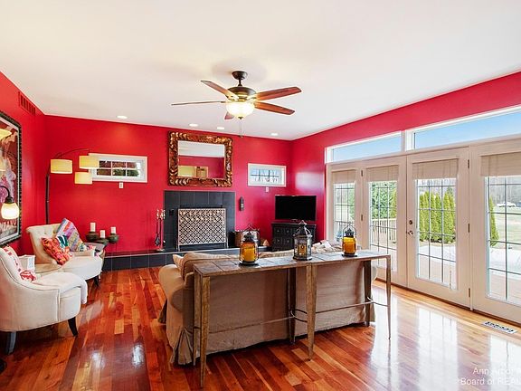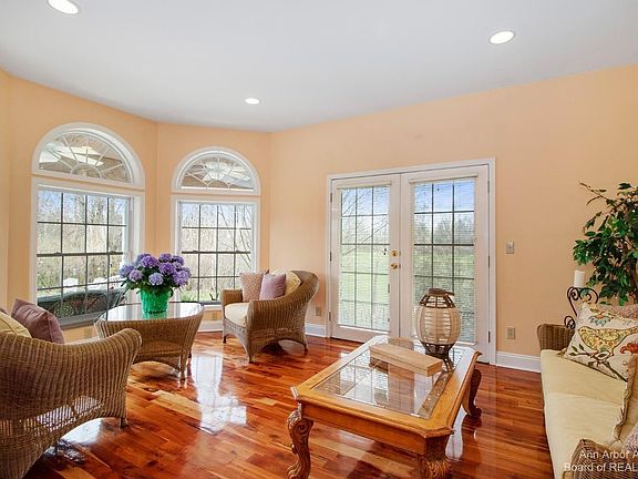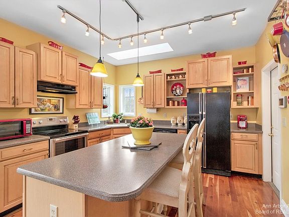 This big, bright, cozy farmhouse-style home greets you with cherry wood floors that lead to the kitchen and family room, where you can relax in front of the tile hearth wood fireplace or open the French doors to the pool deck. The kitchen features hardwood cabinetry, a big prep island with pull-out cabinets and seating, track and pendant lighting, skylight, black and SS appliances, and a dining area. A bright sunroom, dining room, and 1/2 bath complete the first floor. The wood floors and skylights continue upstairs where you'll find the large sunny primary bedroom suite with a fabulous bath with granite countertops, a double vanity, spa tub, private WC and shower room with glass shower, and a walk-in closet with built-ins. There's also 3 other generous bedrooms, a 2nd full bath, and convenient laundry with newer Samsung washer & dryer. The full daylight basement can be finished and offers plenty of storage. The 27' by 14' Trex deck and 24' diameter above ground pool, with a new pump in 2020 (included in sale) offer an oasis from your workday world with a relaxing country view and room for plenty of guests and summer meals. Near Ypsilanti, Belleville, I-94 & Metro.