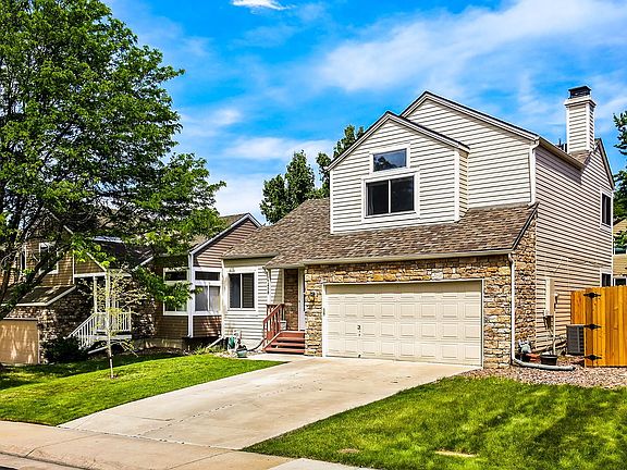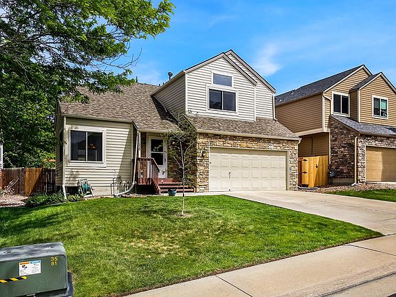Neatly maintained 4 bed /3.5 bath home in coveted Stratford Lakes! Welcome to a flowing main level layout drenched in natural sunlight. Boasting 17'+ ft main level vaulted ceiling with exposed wood beam and hardwood floors extending through Living, Dining and staircase. Spacious eat-in Kitchen with center island and bright Family Room with fireplace. Walk out to the delightful backyard, ideal for outdoor fun. Enjoy an oversized deck, groomed yard and charming garden areas! Wonderfully finished basement is ready for year-round entertainment; features home theater area, built-in speakers, tray ceiling with integrated mood lighting and ample wet bar. Flat screen TVs included! In addition find a private guest bedroom, ¾ Bath and great storage. Three private upper level Bedrooms including Master Suite Retreat with walk-in closet, cathedral ceiling and seamless-glass shower. Desirable location close to schools, shopping and parks. Quick access to Sheridan Blvd, Northwest Pkwy and much more!
