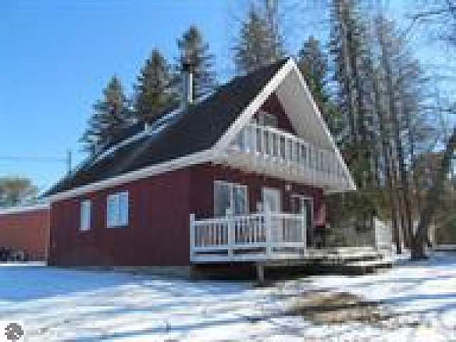 Beautiful river front setting for this cute 3 bedroom chalet! 1 1/2 Bath, wood burning fireplace, master bedroom on main floor, 1/2 bath upstairs with the other 2 bedrooms. All appliances included. Pretty deck on main floor, and small deck upstairs, both give you awesome riverfront views! PLUS the large 4 car capacity pole building! WHAT a BUY!