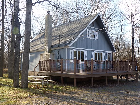ROOMY CHALET WITH NEW ROOF (2019), MOVE IN READY,LARGE LIVING ROOM WITH WOOD BURING FIREPLCE INSERT, DINING AREA, SPACIOUS KITCHEN WITH ISLAND, 2 BEDROOMS, ONE WITH FRENCH DOORS TO REAR DECK, 1 BATH . LARGE LOFT OVERSIZED LOT,. 72 ACRES & SHED. SOLD FURNISHED. SELLERS WILL PAY 1ST YEARS DUES. CLOSE TO BIG BOULDER ,POCONO RACEWAY,JACK FROST SKI & GOLF AREA & SPLIT ROCK GOLF COURSE. BE IN BEFORE 2021