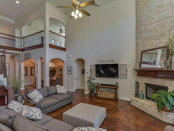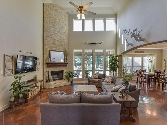 Welcome home to the crown jewel of Texanna Ranch. Located on an interior corner, half acre lot, this is the largest lot in the neighborhood. Enjoy the low maintenance of beautiful stained concrete floors on the first floor. The large kitchen has granite counters and large center island. Custom cabinets with glass fronts and accent lighting. Formal dining, study with private patio, guest suite on first floor and a master suite complete with a Texas size walk in closet. You can access the covered patio, large pool with attached spa and open patio, perfect for entertaining, from the master or breakfast room. Upstairs there is 2 secondary bedrooms, a craft room, game room, and media room. This home has it all!