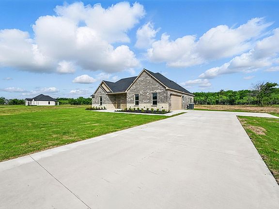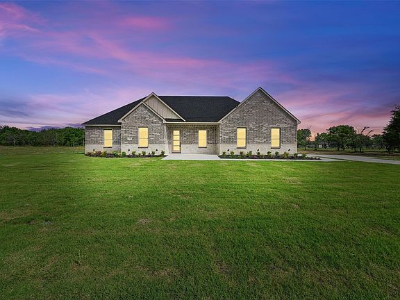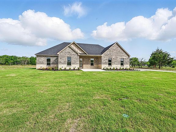 Welcome to this stunning 4-bedroom, 2-bathroom home in the highly sought-after Grison Estates, set on 2 acres of peaceful countryside within Mildred ISD. Showcasing a beautiful stone and brick elevation, this home features ceramic tile flooring, elegant quartz countertops, and a custom-built fireplace with views into both the kitchen and backyard. The kitchen offers generous counter space and cabinetry—ideal for both everyday living and entertaining. The spacious primary suite is a true retreat, complete with a custom accent wall, a spa-inspired bathroom featuring a walk-in shower, freestanding tub, dual vanities, and a large walk-in closet. Step outside to a covered back patio perfect for enjoying serene mornings or stunning sunsets. Additional upgrades include full spray foam insulation, foundation piers for added stability, and a full irrigation system. This home blends luxury, comfort, and functionality—don’t miss it!