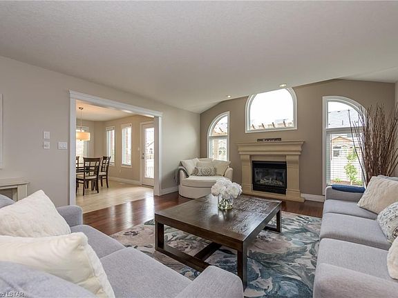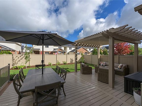 Fabulous 3 + 1 bedroom home with amazing 2nd floor family room boasting 10 ft+ ceiling height! Spacious living room w/ cast limestone fireplace and curved transom windows. Large eat-in kitchen with peninsula island, lots of cabinetry & wall pantry, stainless appliances. Main floor laundry. 2nd floor showcases impressive family room, 3 bedrooms including gracious master suite w/ walk-in closet and 5 piece ensuite w/ glass surround shower & jetted tub. 2nd bedroom enjoys decorative beadboard. 3rd bedroom boasts a cathedral ceiling peak & large arched window. Fully finished lower level adds an inviting den with focal fireplace accented by built in cabinetry/shelving as well as a guest room & 3 piece bath. the backyard has recently undergone some exciting changes (2019) w/ 37k+ in composite decking, pergola & fencing creating a beautiful outdoor retreat - perfect for summer barbecues and relaxing evenings under the pergola. Welcome home.