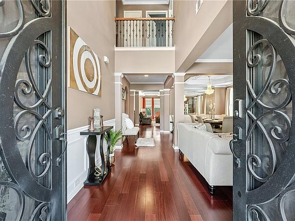 Modern pendant lightCrown moldingCherry stained privacy fenceHuge islandFlex spaceMagnificent iron doorsAdditional media