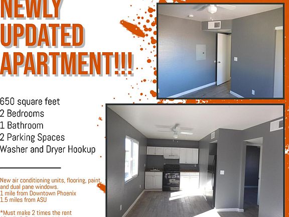 Minutes from Downtown: Freshly renovated, cozy 2 bedroom 1 bathroom apartment in a neighborhood that is rapidly being revitalized. Close to the entertainment, restaurants, employment, shops and nightlife of Downtown Phoenix, and 2 miles from Arizona State University's downtown campus. New air conditioning unit, dual pane windows, and upgraded flooring throughout. Unit also includes washer dryer hook up. 1,425/month with 12 month lease (water, sewer, trash included in rent). Your new home awaits. So, schedule a showing today! *Minimum credit score of 650 required. *Make two times the rent. *Criminal history check required. *None smoking unit. Owner pays water, sewer, and trash. Tenant pays for electricity.