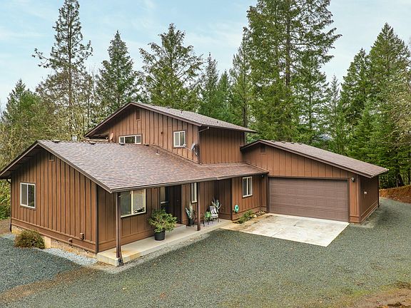 Seclusion and privacy meet with this custom designed home on 5.2 acres. With 1,472 total square feet, on the main level of the home all your living space is encompassed with an open concept living room and kitchen 2 bedrooms, 1 bathroom, the laundry room and a large exterior deck. Walk upstairs to your own primary bedroom and en-suite spanning over 400 square feet with its own covered deck. The thoughtfully designed layout includes a 950 sq ft attached garage plus a bonus room—perfect for hobbies or extra storage. Outside, enjoy peaceful walking trails, a spring, seasonal pond, a full hookup RV pad for guests and located between two boat ramps, your access to the Rogue River is just moments away. This home is well-maintained and move-in ready!