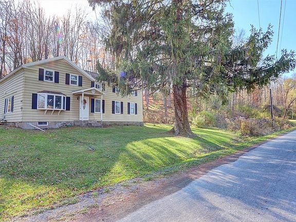 Lovely rural setting only about 3.5 miles from Thruway exit 41. House was gutted, insulated and sheet rocked. Bathroom, windows, well pump, furnace and central air are newer. The enclosed porch (just needs a little finishing) looks out onto the wooded hills and small meandering creek. Spacious rooms. First floor bedroom, bathroom and laundry. From your huge living room you can look out the bow window onto a nature conservation area. Relax in the den. This house has a surprising amount of space in it. Walk-in attic could be a fifth bedroom. Create trails and campsite in your very own park-like wooded setting. Corner lot.