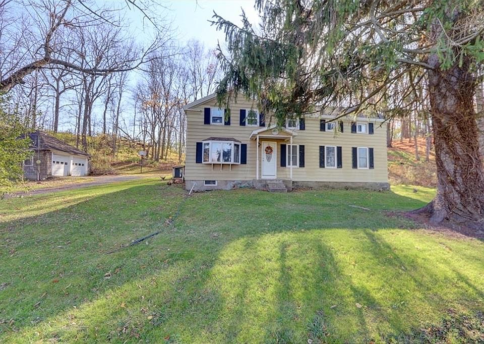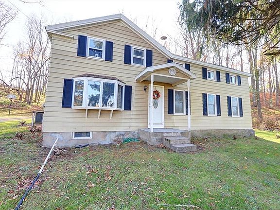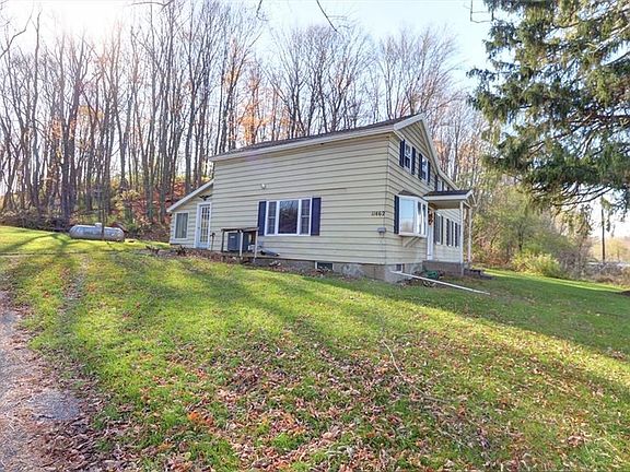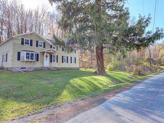 Lovely rural setting only about 3.5 miles from Thruway exit 41. House was gutted, insulated and sheet rocked. Bathroom, windows, well pump, furnace and central air are newer. The enclosed porch (just needs a little finishing) looks out onto the wooded hills and small meandering creek. Spacious rooms. First floor bedroom, bathroom and laundry. From your huge living room you can look out the bow window onto a nature conservation area. Relax in the den. This house has a surprising amount of space in it. Walk-in attic could be a fifth bedroom. Create trails and campsite in your very own park-like wooded setting. Corner lot.