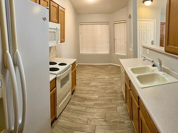 Clean 3 bed + den, 2 bath home in Meridian Pointe. Over 1300 sq ft of space. Home opens to a great room attached to a den with dual entries. Rear door opens to a low maintenance backyard featuring covered patio and small grass area. Kitchen has appliances including refrigerator. Attached to the kitchen is a cozy dining area. Laundry central located off of hallway. Good size master bedroom with private master bath and walk in closet. Two additional bedrooms and a second bathroom located conveniently nearby. Newer wood look tile and brand new wood look vinyl planking make up the flooring through the entire house. Two car garage. Well maintained and clean. Neighborhood includes two playgrounds and four parks including a large park at the end of the street. No smoking. $1900/month rent plus fee, $1500 deposit