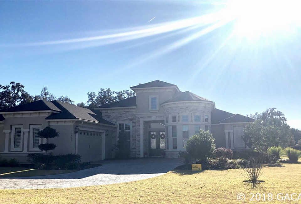 Stunning view and privacy in desirable Oakmont! This very bright Mediterranean-style 4 bed PLUS large office, 3 bath home has everything you need to impress: 12' ceilings, beautiful glossy tile floors, an oversized great room with stone accent wall, a spacious chef's kitchen, granite throughout, plantation shutters, upgraded fixtures and lighting, surround sound, crown molding, and more. You must see this home in person to truly appreciate its splendor and experience how serene the location feels. The backyard faces a protected wooded area, there is public space on one side of the home, and there is a retention area next to that. It's like living in the middle of the country with all of the benefits of being in one of Gainesville's most sought-after communities. Make it yours today!