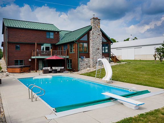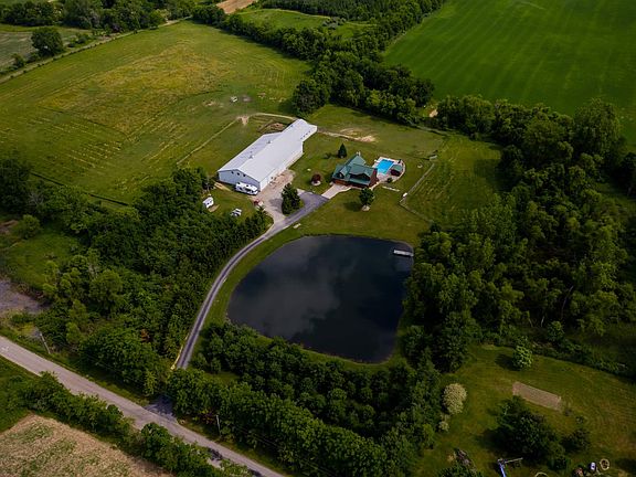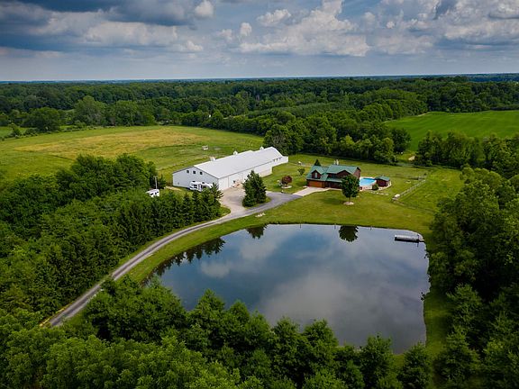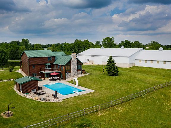 Immaculate property up for sale in Northeastern Indiana! Rural, quiet and convenient location - 5 minutes from Kendallville, 10 minutes from Auburn, and 20 minutes from Dupont Rd/Fort Wayne. This home offers it all! Interior features 4 beds/3.5 baths, solid 6 panel doors, custom kitchen with granite countertops, remodeled bathrooms with tiled walk-in showers - granite vanity tops & bluetooth speakers, master bedroom with walk-in closet, wood burning fireplace with gas log lighter, geothermal heating/cooling with GFA backup unit, constant pressure well, full finished walkout basement and much more! Exterior offers 7 acres of property with the potential to purchase approximately 5 additional acres to the East (predominately pasture area), approximately 29 acres to the North (predominately tillable), and approximately 46 acres to the South of hardwoods/tillable/trails. Northern white cedar exterior, seamless metal roof, covered front porch, composite decking, 20x40 heated inground pool with slide and diving board, hot tub, stocked pond with dry hydrant, paved drive - and this home includes a large barn with overall dimensions of 72x230. The barn is currently configured with a large heated machine shop at one end and the remainder is set up for horses. The horse area currently includes a 72x100 indoor riding arena, a 36x60 horse stable with nine 10x12 stalls, a 12x20 tack room, two 15x40 turnout paddocks, and a 20x36 tramp shed with heated automatic waterer! The machine shop area is 35x72 with a 20x35 heated workshop and bathroom. A 1000 sf guest quarters is located above the machine shop, including a living room, bedroom, full bath & kitchen! Large 14x20 doors on opposite sides of the indoor arena allow easy access with equipment, so the arena could also be used for storage of equipment, motor home, collector cars, toys, etc. Must see to appreciate!
