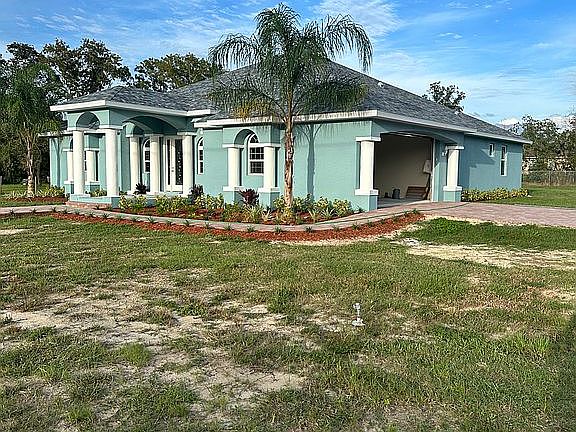 beautiful house built with a spectacular view with a total square footage of 4284 and a living area of 2896 square feet with a large lanai and all the connections for a second kitchen and has a water connection for a refrigerator, it has a bathroom on the lanai for future swimming pool with a large kitchen with lots of space with a large laundry room and cabinets with three bathrooms and three spacious master bathrooms with a comfortable jacuzzi and the shower changes color depending on the water temperature. with a large patio and garden with palm trees and brick entrances