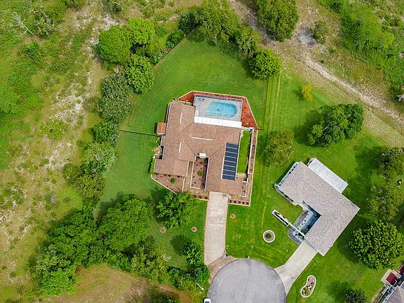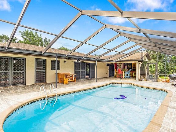 Beautiful 3/2/2 home with solar heated pool situated in park like setting on .63 acre at the end of cul-de-sac. Privacy abounds this fortress with lush landscaping, fenced yard and separate dog run, pavers around pool, outdoor kitchen completely redone with granite countertops, new cabinets and cook top. Gorgeous tile throughout the entire home which features the living room (currently a game room), dining room, family room with wood burning fireplace and wet bar. Granite countertops and stainless steel appliances in kitchen. Inside laundry room and storage galore! All 3 bedrooms have large walk in closets. Security system, oversized garage with workshop, irrigation system with well.