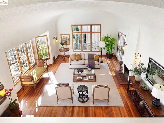 Romance and charm abound in this magical Mediterranean in Berkeley hills offering beautiful architecture. Serene setting with sparkling bay views, bathed in natural light. Dramatic two story entry with a balcony overlooking the grand LR w/ soaring coved ceiling. Expansive views through bay windows. Formal DR in a turret. Luxury remodeled bath. Updated kitchen. Huge lower level w/sep entry, ideal for home office. French doors to private garden. Flexible use of space. Gleaming hardwood floors. Level lawn & hot tub. Lovingly maintained home only minutes to Gourmet Ghetto.