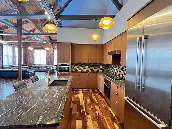 Loft living at its finest! This stunning and truly unique corner Penthouse Loft in the renowned Cigar Factory offers nearly 1,900 sq ft of contemporary loft-style living in the heart of Northern Liberties. With prime deeded garage parking, an additional storage unit, and electric charging stations, this home checks every box for convenience and luxury. Flooded with natural light from oversized windows spanning almost 100 feet, this dramatic space showcases panoramic views to the south, east, and west, including the Ben Franklin Bridge and Center City skyline. The residence features soaring 14' 21' ceilings, exposed beams, heavy timber ceilings, exposed brick, hardwood and tile flooring, and metal detailing, creating an authentic and architectural loft experience. The expansive open floor plan allows for endless possibilities, currently set with two living areas on either end and dining in the center. The thoughtfully positioned kitchen includes a breakfast bar, granite countertops, solid wood cabinetry, and stainless steel appliances. The Primary Suite, located just to the left upon entering, is a true retreat. Recently renovated, it features custom closets, a spacious walk-in closet, a beautifully tiled shower, Toto toilet, heated floors, dual floating vanity, all designed with a spa-like feel. On the opposite side of the condo you'll find the second bedroom area and another full bathroom, which also houses the washer and dryer for added convenience. Additional building amenities include a heated garage, elevator, and secure entry. All just two blocks from the Piazza and Liberty Walk, and moments from the neighborhood's top restaurants, cafes, and shops. Easy access to public transportation, I-95, and I-76 makes commuting a breeze. This Penthouse Loft is truly a rare offering an extraordinary home combining character, scale, and modern updates in one of Philadelphia's most vibrant neighborhoods. A must-see!