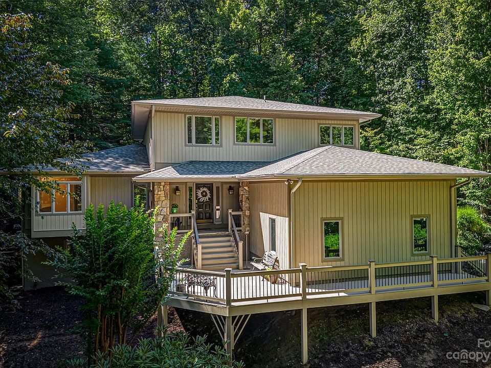 Stunning architecture maximizing natural light and the serene scenes of the forest from within this high elevation home. This home sits prominently above the road in the center of three combined lots. Providing the ultimate in wooded seclusion. As you enter this expertly designed home you'll be pulled to the wall of windows, soaring ceilings, and grandeur of the communal spaces. The finished layout is inline with the perfect amount of living space. Upstairs you'll appreciate the privacy of the bedroom layout separated from the main level primary suite. With an open air concept for the ideal home office or second living room. The lower level has all the overflow space needed with easy potential for additional finished space and storage. The basement is already plumbed for an additional bathroom. On top of that this home is located in the highly desirable community of Connestee Falls. Providing unparalleled natural beauty and amenities. Check out the VIRTUAL TOUR!