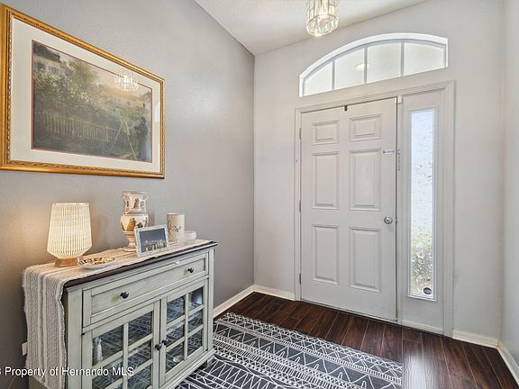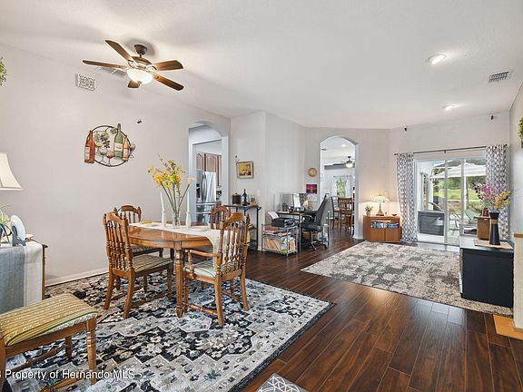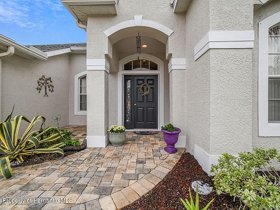 ACTIVE UNDER CONTRACT - ACCEPTING BACK UP OFFERS.- Welcome home to your POOL HOME at 11472 McLeod St. where you will find a 3-bedroom, 2-bathroom home with all the charm and space you need for a comfortable Florida lifestyle. When you arrive at this home, you will immediately notice the curb appeal with the paver driveway and meticulous landscaping. You will enter the home to the formal living/dining room with laminate floors, which leads to the kitchen and family room, providing a spacious floor plan for entertaining family and friends. The kitchen features 42-inch wood cabinets, Corian counters, and stainless-steel appliances, including a newer stove, microwave, dishwasher, and sink. The kitchen overlooks the family room where you can curl up to read a book by the wood burning fireplace. When entertainment is not on your agenda, you can retreat to your master suite with two walk-in closets and sliding glass doors leading to the outdoor lanai. Or ease into a hot bath in your master bathroom garden tub. The master bathroom has a separate shower, double sinks and plenty of cabinet and counter space. This functional split floor plan features the second and third bedrooms on the opposite side of the home with the second bathroom. If the beauty of this home's interior is not enough, step outside through the sliding glass doors onto the screened lanai with a private pool! Not many homes in the community have a private pool to relax in the sun during the warmer months. All but two windows have been replaced. Shingle roof was replaced in 2023. HVAC was replaced in July 2022. Wellington at Seven Hills is a gated 55+, maintenance free community with a club house, community pool, restaurant, fitness center, and tennis courts. Spectrum Fiber Optics is currently being installed throughout the community. Perfectly located within the community with a close by resident only gate, and also close to the Suncoast Parkway. No flood insurance required.