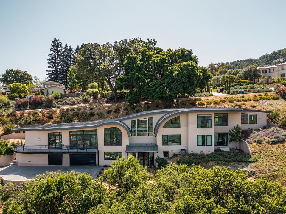 On a vast corner lot of more than 1.2 acres with absolute privacy, this avant-garde contemporary home is perfectly positioned to take full advantage of sweeping San Francisco Bay views & the surrounding hillsides. Every room in the three-story home presents the views through massive windows & glass doors opening to wraparound front balconies. Curved standing seam roof lines, creating half-barrel vaults above the living room & dining room, are a signature of the design. Inside, wide open spaces tie together with glass-lined stairways & balconies to ensure unobstructed views. A contemporary European kitchen features Bauformat cabinetry with Miele and Liebherr appliances & adjoins the family room for everyday living. Ground-floor suite ideal for guests or a home office, two bedroom suites on the main level, plus a top-floor suite & the luxurious primary suite. Sleek design inside & out, incredible privacy and views, plus an unbeatable location minutes to trailheads and to Highway 280.